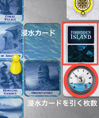 浸水カードで表示されたタイルは、浸水します。もし、タイルが浸水していた場合は、タイルがゲームから取り除かれます。