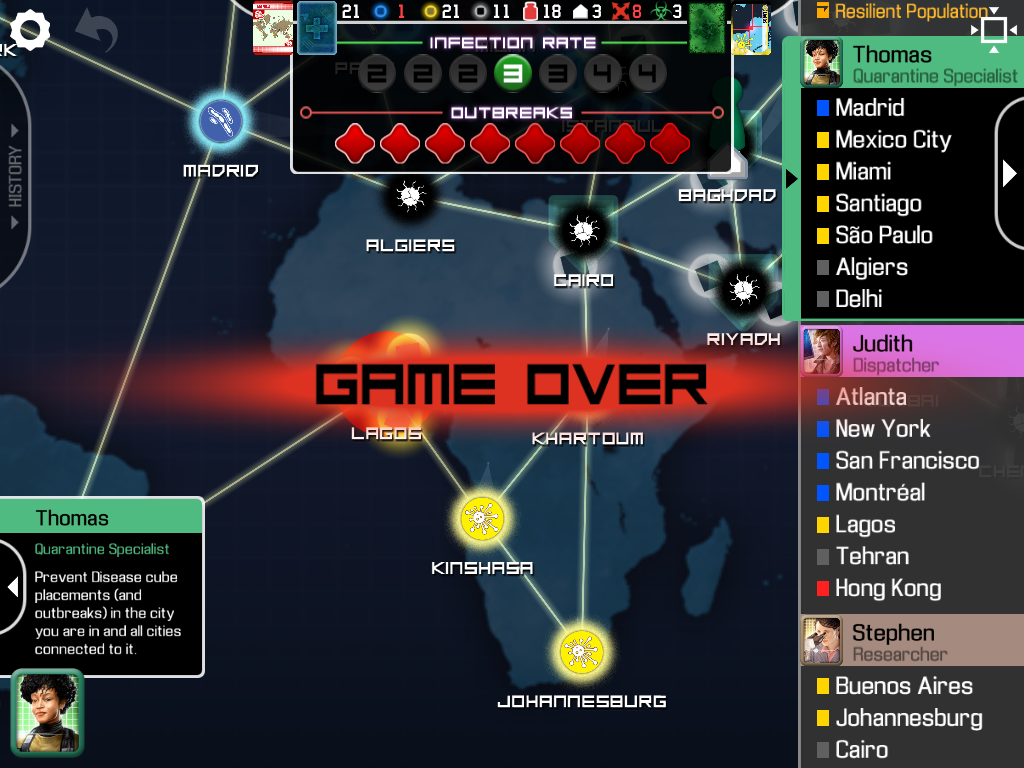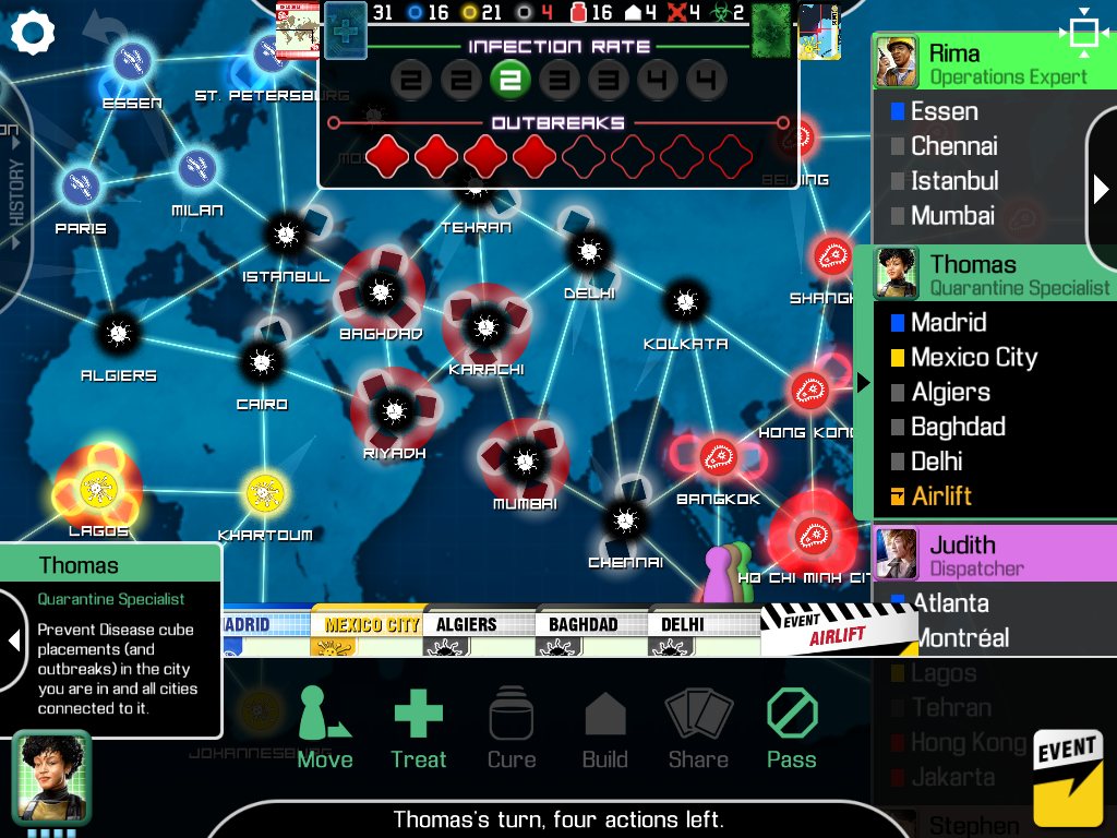 ウイスルのコマが3つ以上同じ都市にあり、さらにウイルスコマがその都市に増えるとアウトブレイクがおきます。