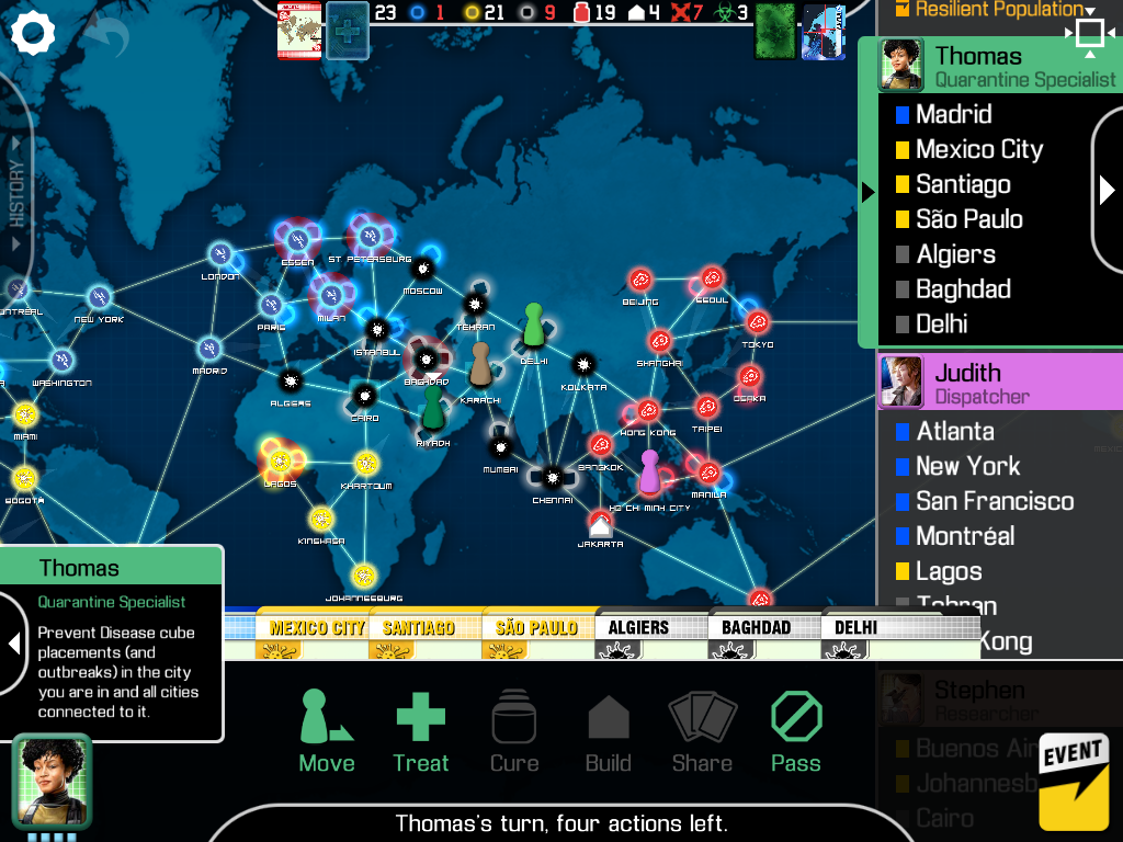 自分の手番では、移動したり、ウイルスを除去したり、ワクチンを開発したり、研究所を作ったり、カードを交換したりが合計4回できます。
